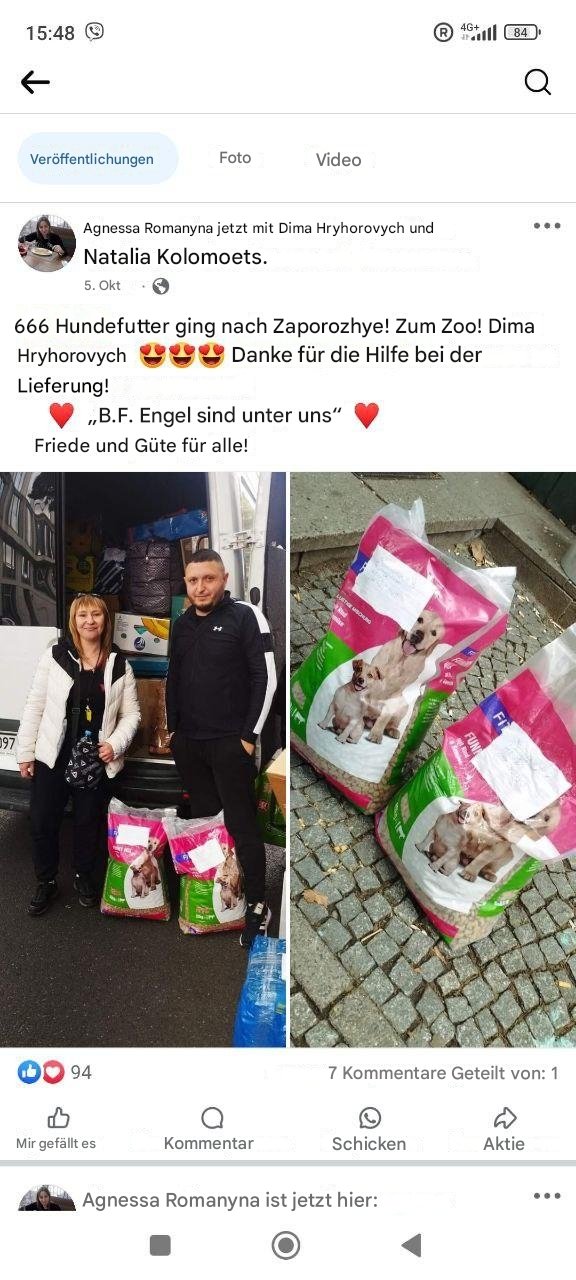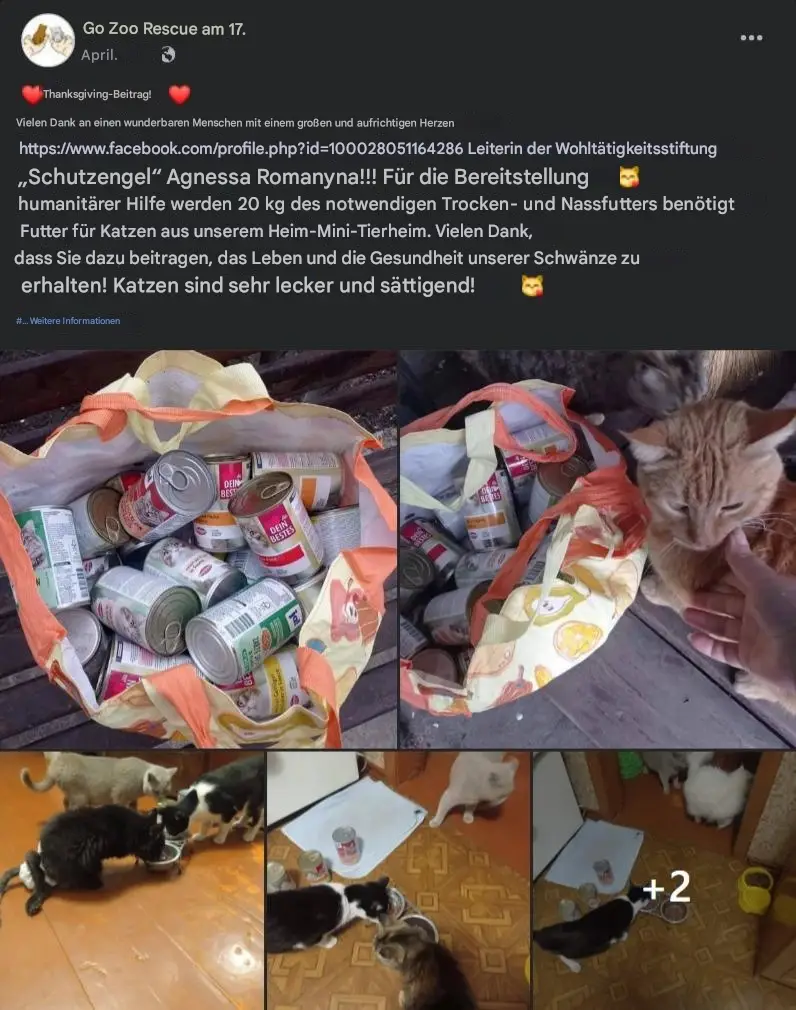 Jede Spende bedeutet echte Hilfe. Ihre Mittel könnten beispielsweise in den Kauf von Futter für Hunde und Katzen fließen, die obdachlos geworden sind. Futterspenden für Tierheime helfen dabei, die Tiere täglich zu ernähren, was besonders wichtig ist in Gebieten, in denen die Versorgung aufgrund des Konflikts eingeschränkt ist. Ein Teil der Spenden geht auch an die medizinische Versorgung der Tierheime einschließlich der Behandlung von Wunden und Krankheiten sowie der Impfung der Tiere, um die Ausbreitung von Infektionen zu verhindern.